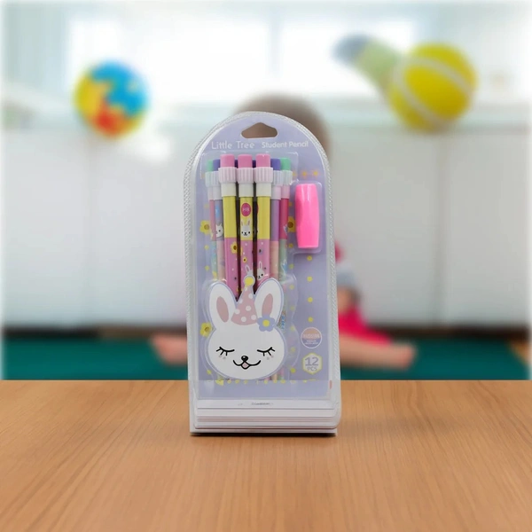 CUTE RABBIT BEAR DRAWING GRAPHITE WRITING PENCIL SET WITH PENCIL SHARPENER & ERASER (14 PC SET)